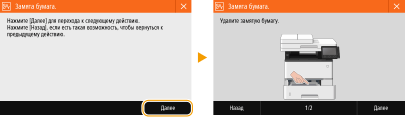 При замятии бумаги на экране отображается сообщение <Замята бумага.>. Выберите <Далее>, чтобы отобразились простые варианты решения проблемы.