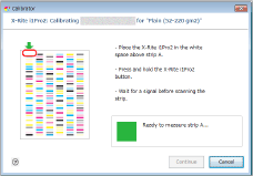 Tlačítko spektrofotometru držte, dokud se nezobrazí zpráva [Scanning strip A]. Se stisknutým tlačítkem pohybujte spektrofotometrem seshora dolů a naskenujte proužek A.