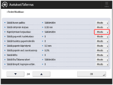 Valitse luettelosta muokattava paperityyppi → paina <Tiedot/Muokkaa> → <Muuta> kohdassa <Käpristymisen korjaustaso>.