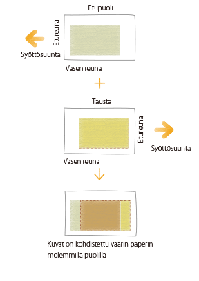 Laite päättää tulostuksen alkukohdan paperin etureunan perusteella. Kun paperi etupuoli on tulostettu, paperi käännetään ja tulostetaan paperin taustapuolelle takareunasta alkaen. Tämän vuoksi tulostuksen alkamiskohta voi olla hiukan erilainen paperin vastakkaisilla puolilla.