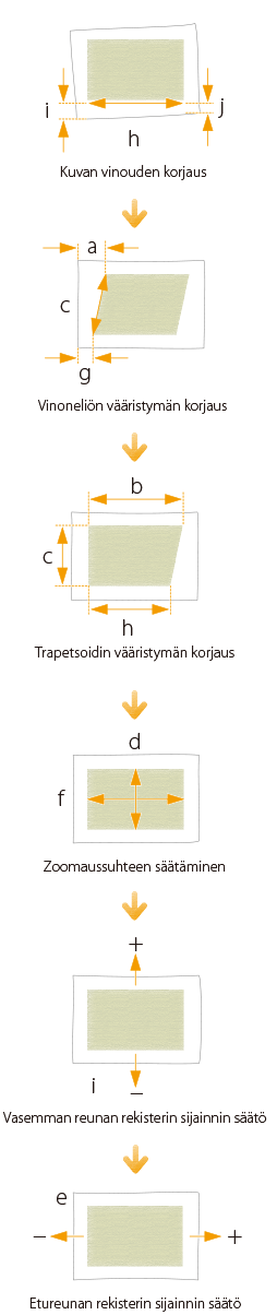 Vinosyötön ja vinoneliön/trapetsoidin vääristymän korjaaminen pienen testisivun avulla