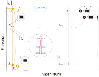 Jos testisivu on niin pieni, että "a" ei ole sivulla, lisää satunnaismerkki "a'" punaiselle viivalle "c". Anna etäisyys merkistä "a'" paperin etureunaan kohdassa [a]. Anna etäisyys merkistä "g" merkkiin "a'" kohdassa [c].