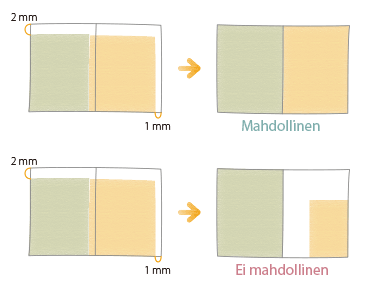Jos tulostuksen tulos poikkeaa odottamastasi esimerkiksi alla olevan kuvan mukaisesti, muuta asetuksia seuraavasti. Näitä asetuksia voi muuttaa jokaiselle työlle.