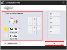 → <Yleisasetukset> → <Paperiasetukset> → <Paperiasetukset> → valitse paperilähde, jossa on sen koon mukaan määritettyä paperia → anna mitattu arvo kohtaan <Muokattu koko>.