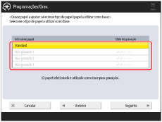 Quando os padrões para calibração são substituídos, os dados perdem-se. Certifique-se de que não substitui o padrão para calibração de "Canon Top Colour Zero FSC (81,4 g/m2)" quando registar um novo padrão de calibração para o papel que pode utilizar para calibração.