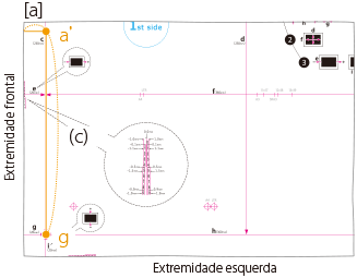 Se a página de teste for tão pequena que "a" não está na página, adicione uma marca arbitrária "a'" na linha vermelha "c". Introduza a distância de "a'" para a extremidade frontal do papel em [a]. Introduza a distância de "g" para "a'" em [c].