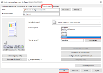 Selecione o separador [Paper Source] e especifique as programações consoante abaixo descrito → clique em [OK].