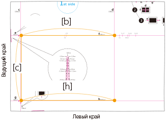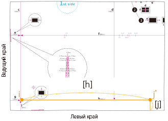 Если формат тестовой страницы настолько мал, что метка j отсутствует на странице, добавьте произвольную метку j' в любом месте красной линии h. Затем укажите расстояние от j' до левого края бумаги в [j]. Укажите расстояние от i до j' в [h].