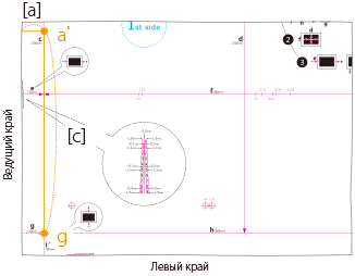 Если формат тестовой страницы настолько мал, что метка a отсутствует на странице, добавьте произвольную метку a' на красной линии c. Укажите расстояние от a' до ведущего края бумаги в [a]. Укажите расстояние от g до а' в [c].
