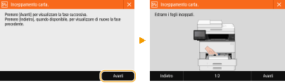 Se si verifica un inceppamento carta, sullo schermo viene visualizzato <Inceppamento carta.>. Selezionare <Avanti> per visualizzare semplici soluzioni.
