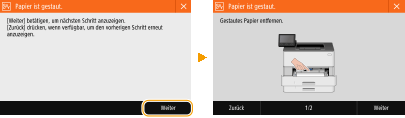 Wenn es zu einem Papierstau kommt, wird <Papier ist gestaut.> auf dem Bildschirm angezeigt. Drücken Sie <Weiter> (