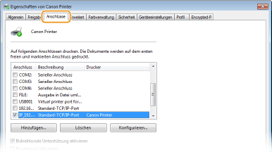 Es kann zu Fehlern beim Drucken kommen, wenn sich die IP-Adresse des Geräts geändert hat oder wenn über den Windows-Druckerordner ein Drucker hinzugefügt wurde. Diese Fehler sind normalerweise auf fehlerhafte Druckerporteinstellungen zurückzuführen. Eventuell wurde eine falsche Portnummer oder ein falscher Porttyp angegeben. In solchen Fällen schlägt das Drucken fehl, weil die Dokumentendaten nicht an das Gerät übertragen werden können. Beheben Sie solche Probleme, indem Sie die Druckerporteinstellungen am Computer konfigurieren.