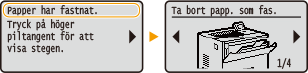 Ett larm hörs om ett pappersstopp inträffar och meddelandet <Papper har fastnat.> visas på skärmen. Tryck på