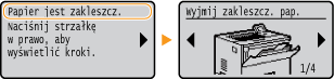 Jeśli dojdzie do zacięcia papieru, generowany jest alarmowy sygnał dźwiękowy, a na ekranie wyświetlana jest wiadomość <Papier jest zakleszcz.>. Naciśnij przycisk