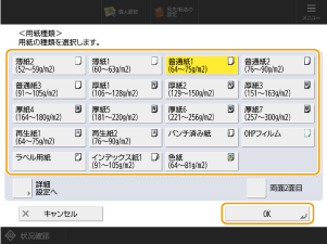 手差しトレイに用紙をセットすると、用紙サイズと種類を設定する画面が表示されます。