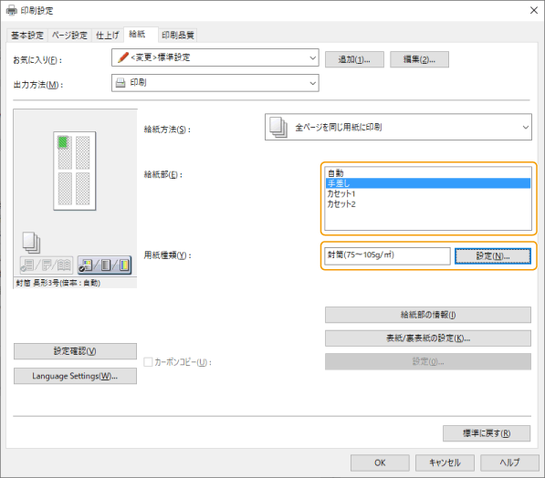 [給紙部]で[手差し]を選び、[用紙種類]で[封筒]を選ぶ