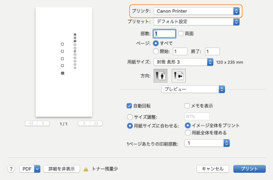 [用紙サイズ]でセットした封筒のサイズを選び、[用紙種類]で[封筒]を選ぶ