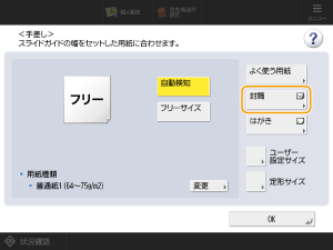 手差しトレイに封筒をセットすると、用紙サイズを設定する画面が表示されます。以下の手順に従って設定してください。