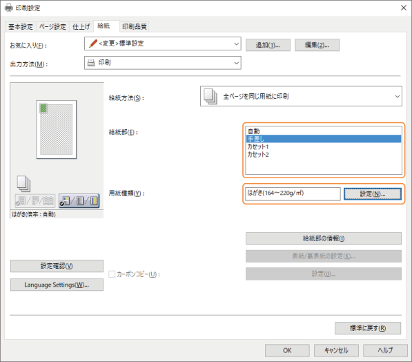 [給紙部]で[手差し]を選び、[用紙種類]で[はがき]を選ぶ