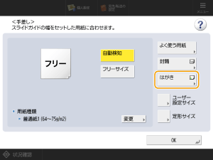 手差しトレイにはがきをセットすると、用紙サイズを設定する画面が表示されます。以下の手順に従って設定してください。