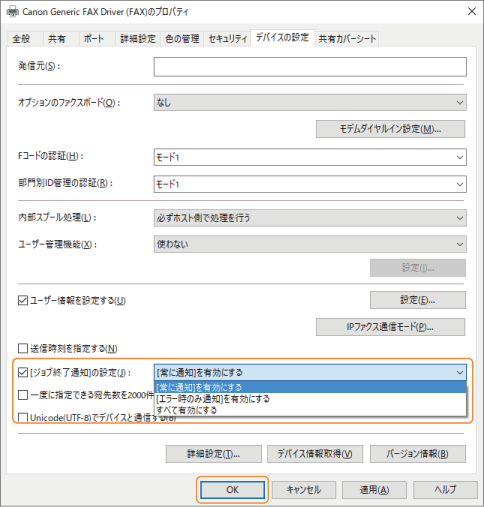 [デバイスの設定]タブで[[ジョブ終了通知]の設定]を選び、[OK]をクリックする