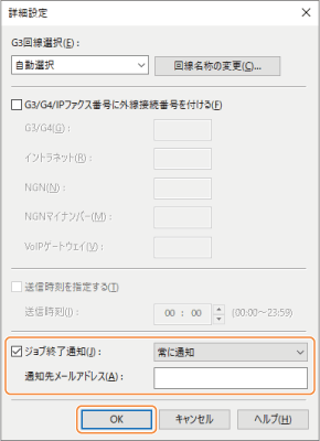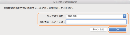[ジョブ終了通知の設定]ダイアログで[ジョブ終了通知]を選び、[通知先メールアドレス]にメールアドレスを入力して[OK]をクリックする