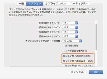 [オプション]タブで[ジョブ終了通知]の設定を選び、[OK]をクリックする
