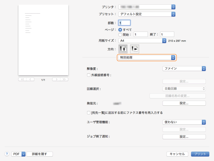 プリントダイアログのポップアップメニューで[特別処理]を選ぶ