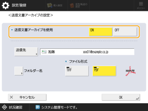 <送信文書アーカイブを使用>の<ON>を押す