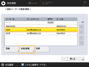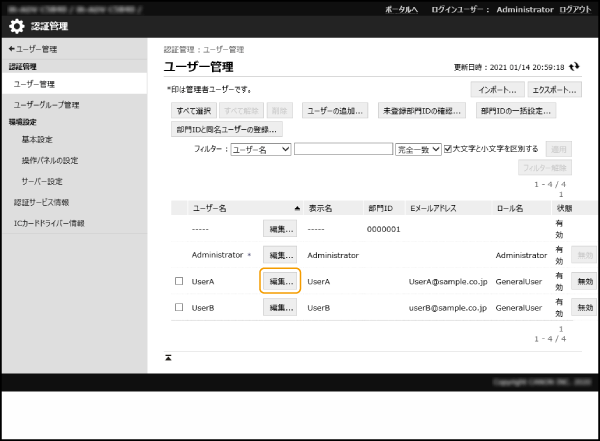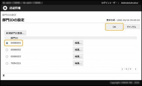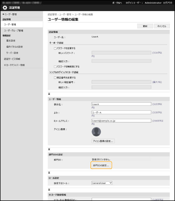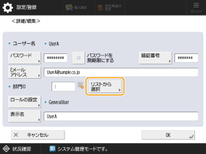 登録されているユーザー名に対応した部門IDに対して、部門別ID管理を行います。本機に登録したユーザーに部門IDが設定されているか確認してください。