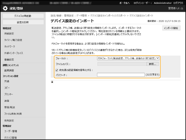 デバイス設定(転送設定、アドレス帳、送信のよく使う設定)をインポートする場合
