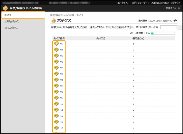 [ボックス]ページでユーザーボックスの番号をクリックする