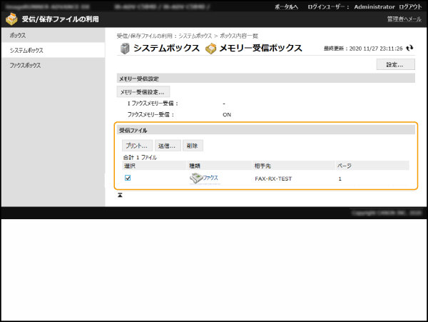 [システムボックス]を選び、[メモリー受信ボックス]をクリックする