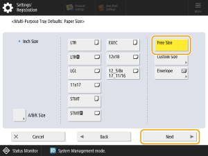 Depending on your model, <Free Size> may not be selectable. In this case, select an existing paper size, such as <A4> or <LTR>.