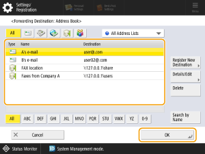 Select the registered e-mail address for user A as the forwarding destination and press <OK>.