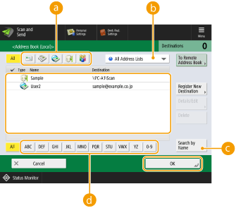 Drop-down list for selecting Address Book typesEnables you to display a specific group of destinations. When you are logged in to the machine with personal authentication management, selecting <Personal Address List> displays your personal Address Book.
