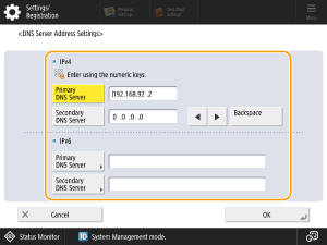 If there is a secondary DNS server, press <Secondary DNS Server> and enter the IP address. You cannot enter addresses that begin with "ff" (multicast addresses), addresses consisting entirely of zeros (0), or link-local addresses. To proceed without specifying a secondary DNS server, leave the field blank.