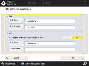 When the host name and domain name are the same as those set for IPv4, press <On> in <Use Same Host Name/Domain Name as IPv4>. To configure different settings, press <Off>.