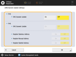 In <Register Stateless Address>/<Register Manual Address>/<Register Stateful Address>, set the address to be registered on the DNS server to <On>. Note that the settings will not be automatically updated if all these are set to <Off>.