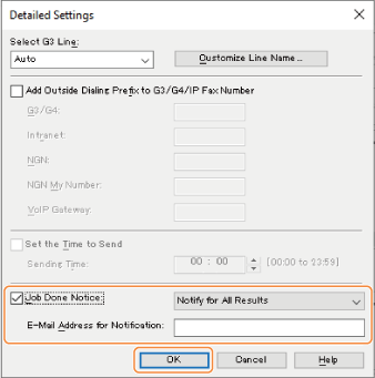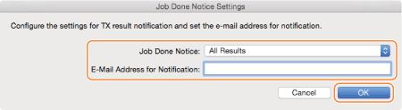Select [Job Done Notice], enter an e-mail address in [E-mail Address for Notification] and click [OK].