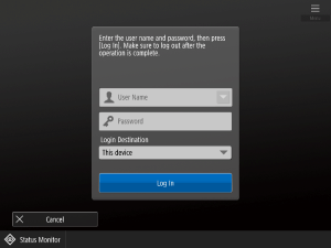 If the login screen appears, a registered authorized user must log in to continue using the machine. The content displayed on the login screen differs depending on the user management settings, and users should proceed according to the displayed content.