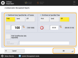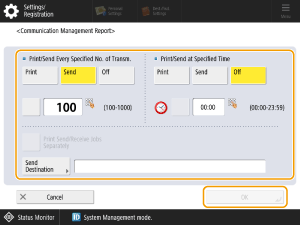 If <Display Job Log> in <Management Settings> is set to <Off>, you cannot configure the Communication Management Report settings. Also, if you change <Display Job Log> of <Management Settings> from <Off> to <On>, the <Print/Send Every Specified No. of Transm.> and <Print/Send at Specified Time> settings for Communication Management Reports are automatically set to <Off>.