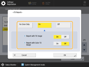 Select <For Error Only> in step 4. This enables the <Allow Printing from Options> setting. Set <Allow Printing from Options> to <On> to specify whether to print <TX Report> for each job from <Options>.