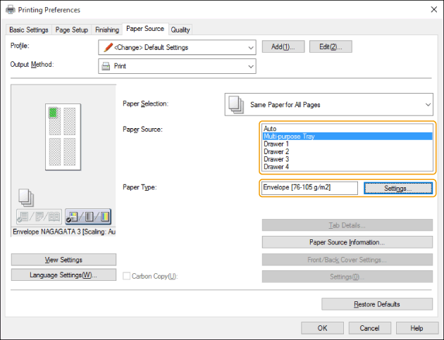 In [Paper Source], select [Multi-purpose Tray] and then select [Envelope] in [Paper Type].