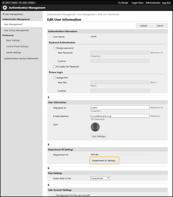 The user information and passwords used for managing department IDs must match the information registered for local device authentication in User Authentication. If a registered department ID or PIN has changed, for example due to machine information distribution, you should also change the user information used for local device authentication.