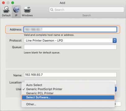 Enter this machine's IP address in [Address] and select [Select Software] in [Use].