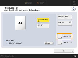 When you load paper into the multi-purpose tray, the screen for setting the paper size and type appears.