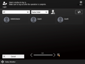 If the login screen appears, a registered authorized user must log in to continue using the machine. The content displayed on the login screen differs depending on the user management settings, and users should proceed according to the displayed content.