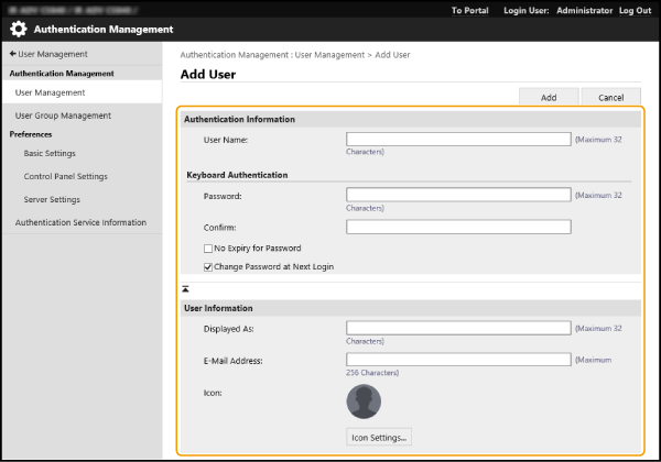 By default, the registered administrator name (user name) is "Administrator." You cannot delete this user, but you can disable it once you have added another user as an administrator.