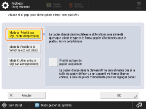 Lorsque vous donnez la priorité aux paramètres de papier du pilote d’imprimante, la priorité est donnée aux paramètres de format et de type de papier. Si vous souhaitez donner la priorité uniquement au type de papier, sélectionnez <Priorité au type de papier uniquement> dans <Mode A (Priorité aux réglages du pilote d'impression)>.